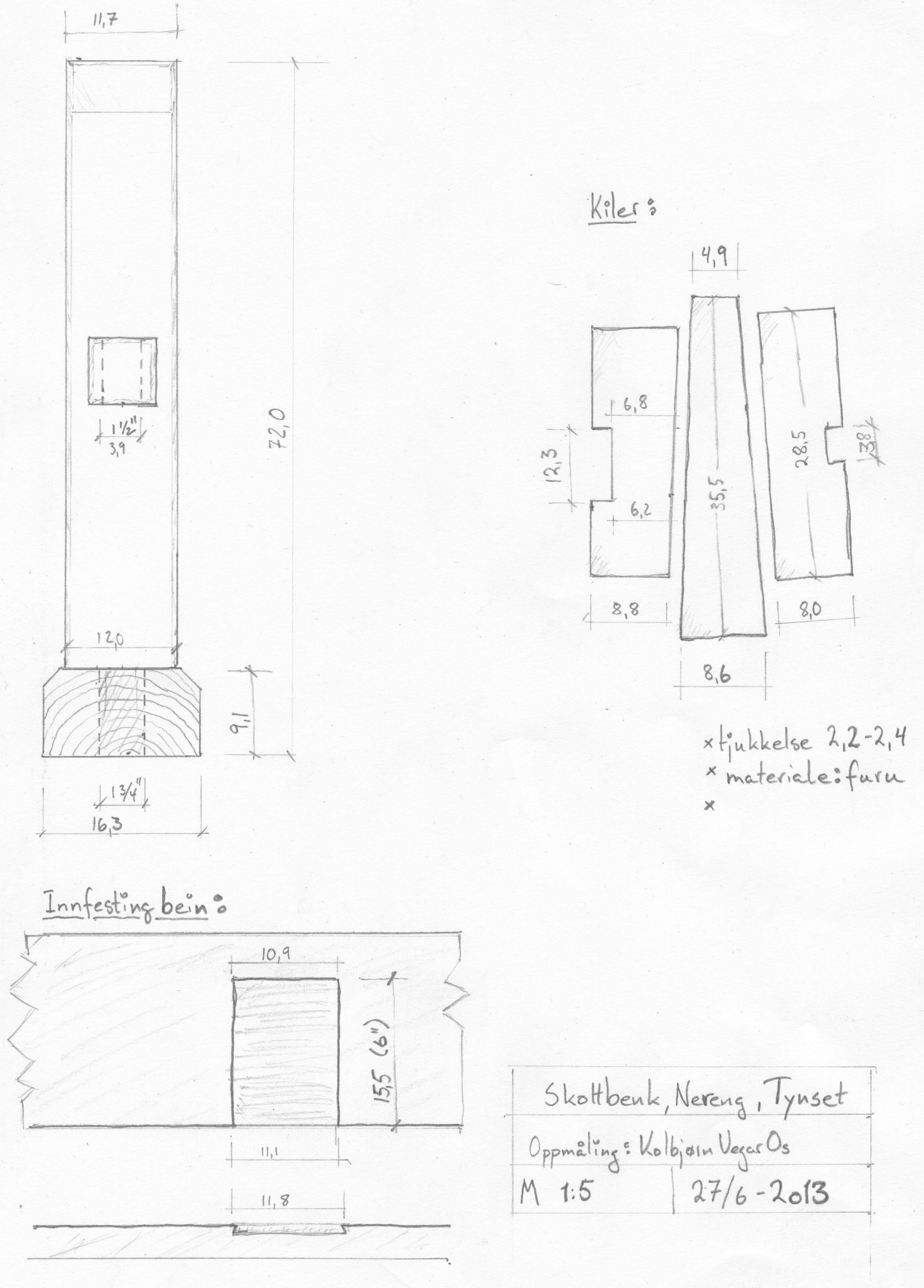 På garden Nereng på Tynset var det ein gardsauksjon denne sommaren. Mellom mykje forskjellig rart som låg i vognskjulet var det ein skottbenk. Heldigvis klarte eit av våre medlemmar, Kolbjørn Vegar Os, å få kjøpt skottbenken. Den viser seg å vere ein av svært få skottbenkar med kilestramming som faktisk har med nokre av kilane som høyrer til. Kolbjørn har laga ei oppmålingsteikning som har med dei mest sentrale måla på skottbenken. Legg merke til at Kolbjørn har teikna inn orienteringa av årringane på dei ulike emna. Dette kan vere relevant å få med sidan det kan verke inn på korleis emna oppfører seg.