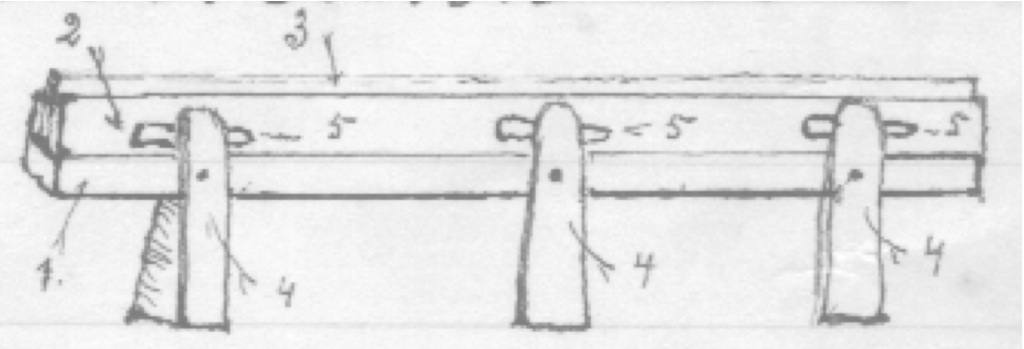 Skisse av skåtbeink av K. Gjesme i Lærdal. Tala på skissa er forklara i teksten. 1. (plo) aos te ha unde. 2. Ein planke pao kor sia. 3. Imødlo dei plankad´n bore so ska hevlast beint. 4. Føted´n me klemma uppe før plankad´n. 5. Kjila te å slao plankad´n å bore fast me.